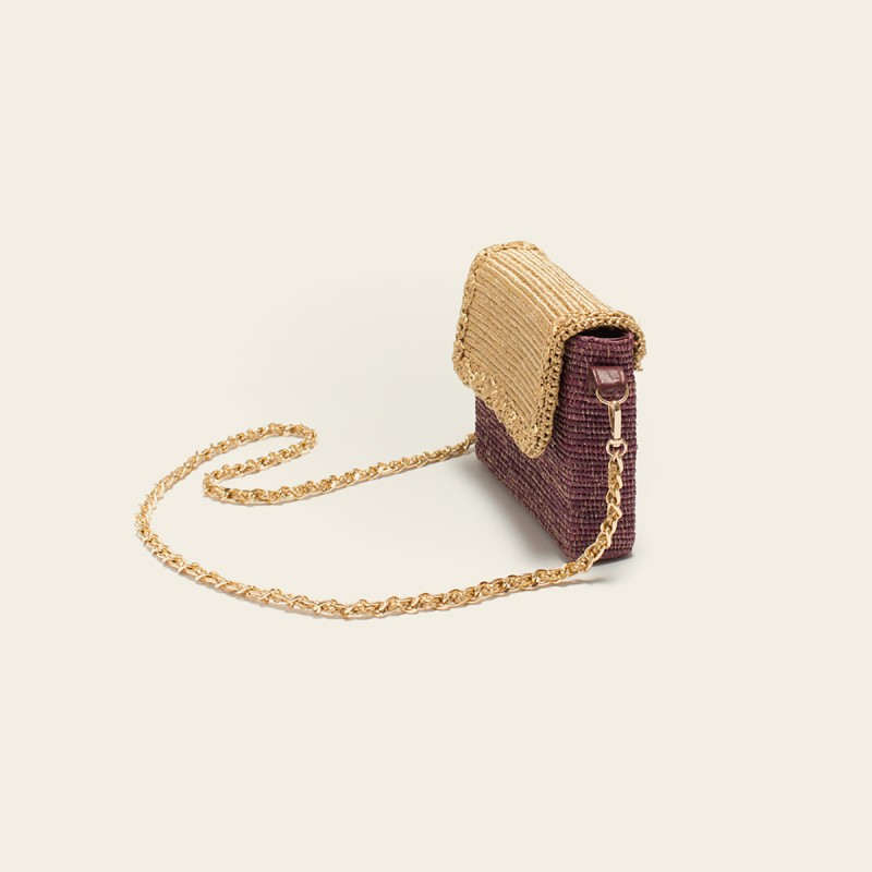 Charmant petit sac de soirée prune en raphia naturel tressé. Son rabat en gold brodé dissimule un fermoir aimanté et la doublure intérieure en cuir prune. Une délicate tresse de métal et de raphia forment la bandoulière.