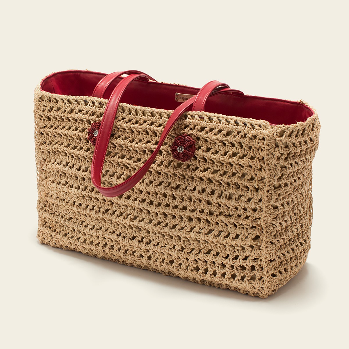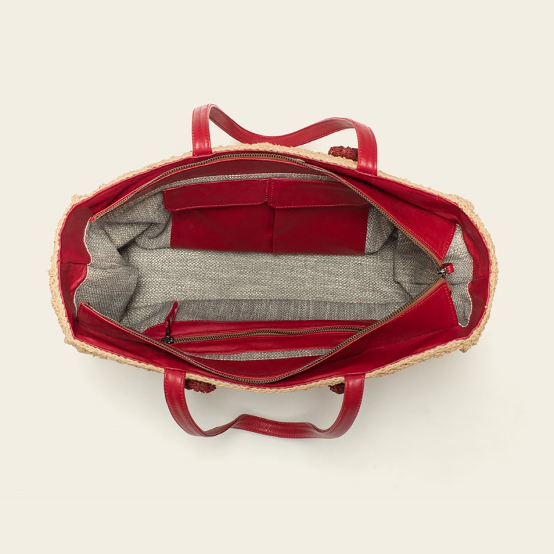Grand sac Esprit Cabas en raphia naturel, il est réalisé au crochet. Un bouton de fleur rouge orne le devant et renvoie aux anses en cuir de la même teinte. La doublure intérieure en cuir et en tissus gris fait ressortir les poches assorties aux anses.